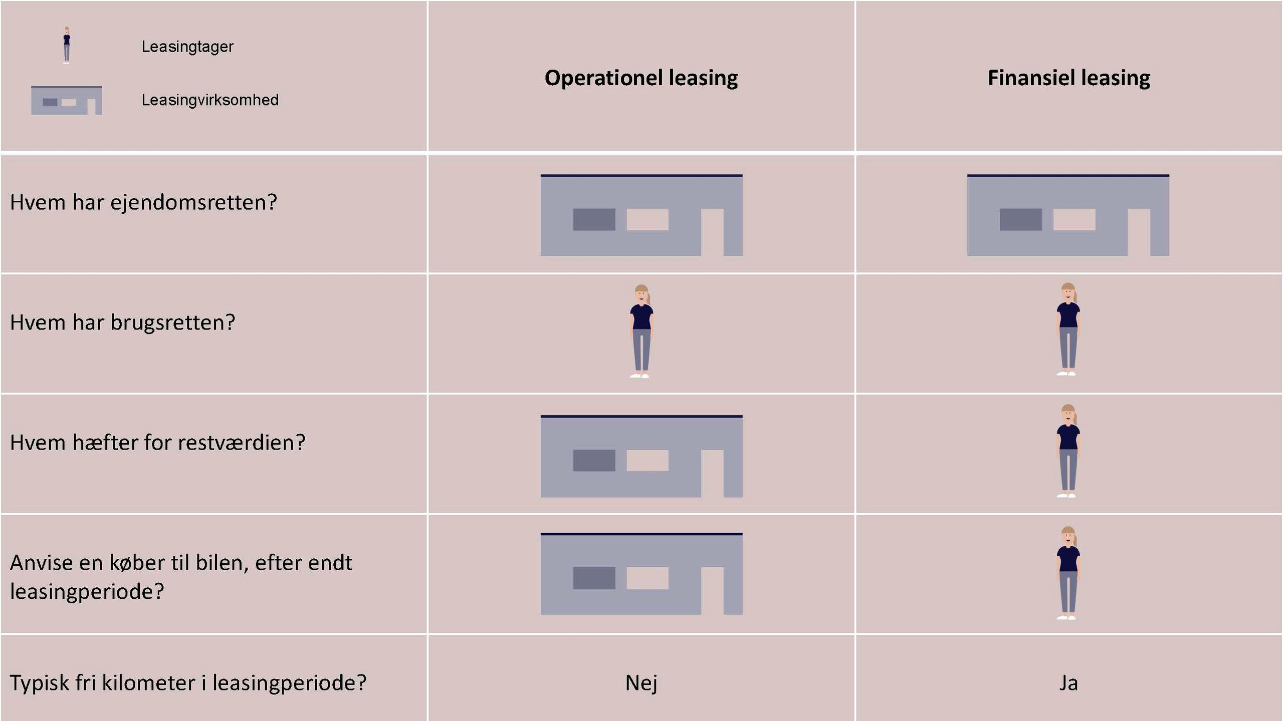 Hvis du vælger at lease en bil, er der to forskellige typer af leasing: operationel leasing og finansiel leasing. Leasingvirksomheden står i begge tilfælde registreret som ejer af bilen, mens du, der leaser bilen, står registreret som bruger af bilen.