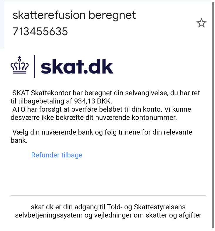 Es sind falsche E-Mails im Umlauf, die aussehen, als würden sie von einem der 7 Ämter der Dänischen Zoll- und Steuerverwaltung (Skatteforvaltningen) stammen. Wir empfehlen dringend, nur Links in E-Mails anzuklicken, wenn Sie sicher sind, dass diese echt sind. Auf dieser Seite können Sie Beispiele für falsche E-Mails und SMS sehen.