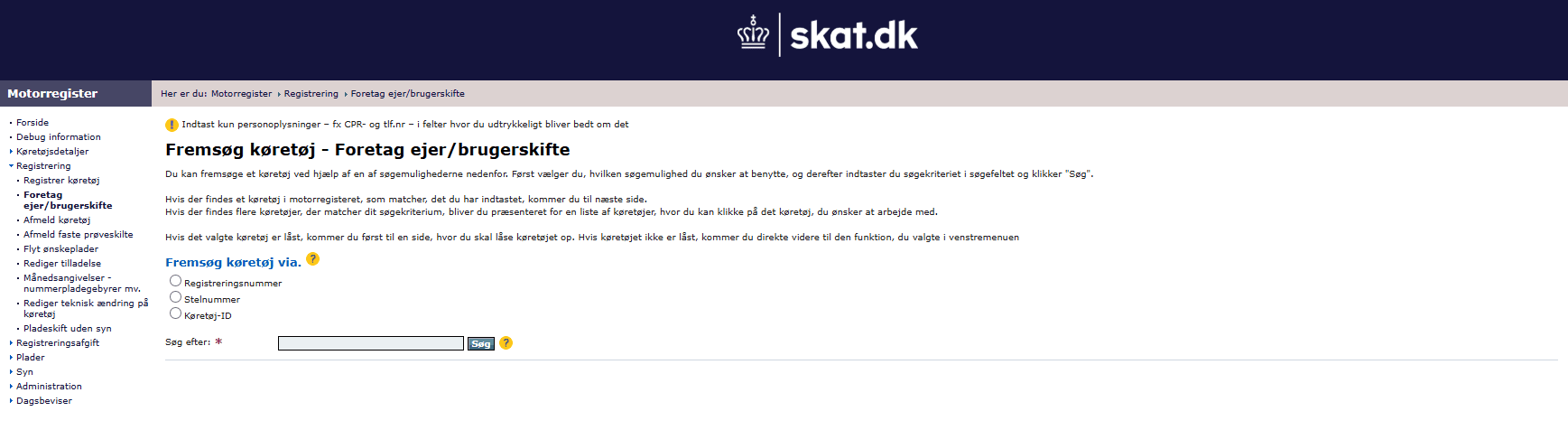 Hvis et køretøj skal omregistreres, kan du gøre dette i menupunktet ”Registrering” → ”Foretag ejer/brugerskifte”.