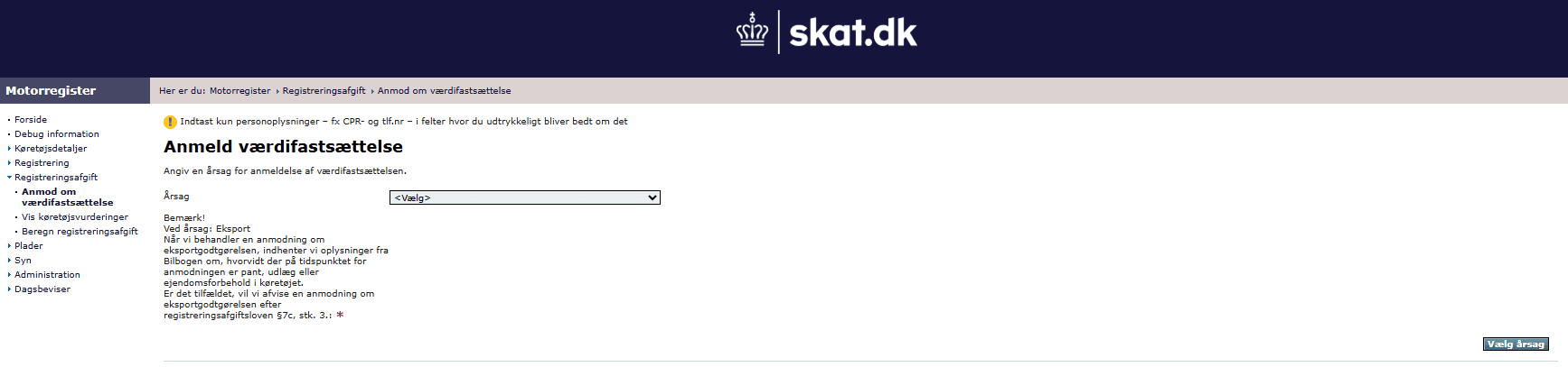 Hvis et køretøj skal importeres, skal køretøjet have et udvidet registreringssyn (registrerings- og toldsyn). Derefter skal der anmodes om værdifastsættelse i menupunktet ”Registreringsafgift” → ”Anmod om værdifastsættelse”.