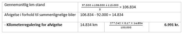Personbil med kilometerstand på 99.000 km, som er lavere end den gennemsnitlige kilometerstand i sammenligningsgrundlaget. Derfor skal handelsprisen reguleres.