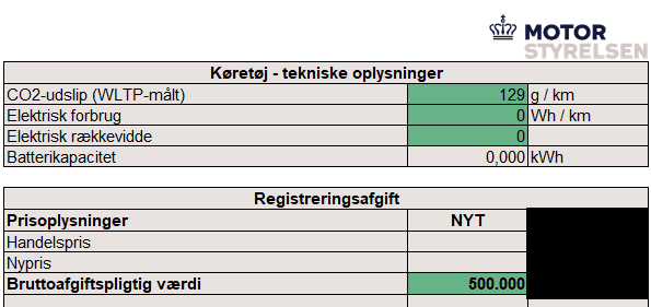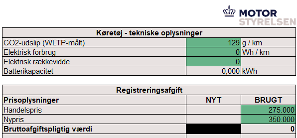 Du skal indtaste dit køretøjs tekniske oplysninger og den bruttoafgiftspligtige værdi i de grønne felter.
