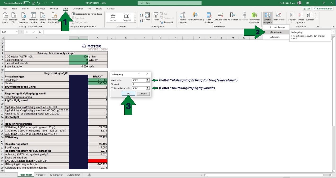 Bruger du Excel-filen uden makro (”xlsx”), skal du foretage en målsøgning som vist på billedet her og trykke ”OK” for at se den endelige registreringsafgift.